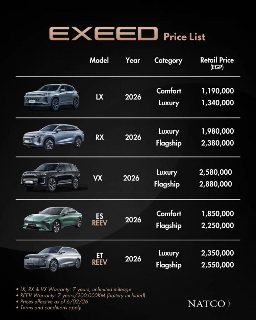 كشفت علامة إكسيد EXEED عن أحدث قائمة أسعار سياراتها في مصر لموديلات عام 2026، لتؤكد استمرارها في تقديم باقة متنوعة من الطرازات التي تجمع بين الفخامة والتكنولوجيا المتقدمة، مع مستويات تجهيز متعددة تلبي احتياجات شرائح مختلفة من العملاء.