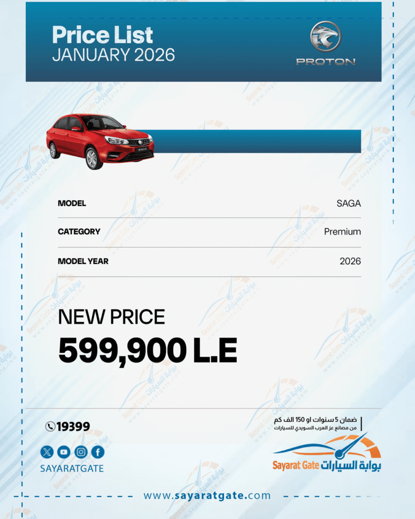أعلنت بروتون مصر عن تحديث السعر الرسمي لسيارة Proton Saga CKD فئة Premium موديل 2026، في خطوة جديدة تؤكد التزام العلامة الماليزية بتقديم سيارات عالية الجودة بأسعار تنافسية تلائم احتياجات السوق المصري، وتعزز من انتشار السيارات المُجمعة محليًا.