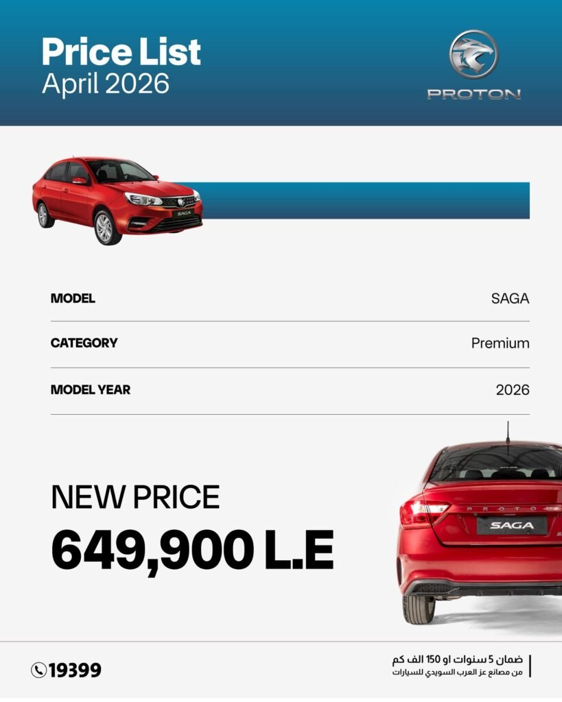 أعلنت Proton مصر عن أحدث قائمة سعرية لشهر أبريل 2026، والتي شهدت تقديم سيارة Proton Saga 2026 فئة Premium موديل 2026 بسعر رسمي يبلغ 649,900 جنيه، في خطوة تعكس استراتيجية الشركة لتعزيز حضورها داخل السوق المصري.