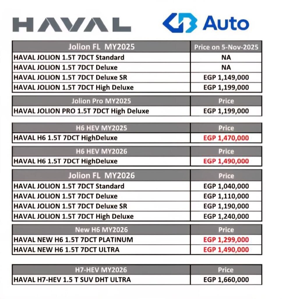 أعلنت شركة جي بي أوتو، وكيل علامة هافال في السوق المصري، عن تطبيق تخفيضات جديدة على عدد من طرازات هافال، حيث وصلت الخصومات إلى 100 ألف جنيه على بعض الفئات. وشملت التخفيضات تخفيض سعر Haval H6 HEV بمقدار 100 ألف جنيه، فيما حصلت فئة New H6 Ultra على تخفيض يبلغ 65 ألف جنيه، كما تم تخفيض سعر New H6 Platinum بقيمة 55 ألف جنيه.