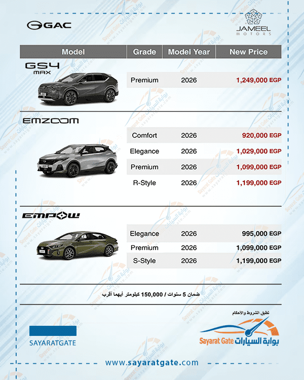 وفي هذا السياق، أعلنت جميل موتورز عن تقديم تخفيضات جديدة على طرازGS3 Emzoom، والذي يتوافر في السوق المصري لموديلات عام ٢٠٢٦ بأربع فئات تجهيزية هي ComfortوElegance و PremiumوR-Style، حيث تبدأ أسعار الفئات بعد التحديث من ٩٢٠.٠٠٠ جنيه مصري لفئة Comfort ، و١.٠٢٩.٠٠٠ جنيه مصري لفئة Elegance، و١.٠٩٩.٠٠٠ جنيه مصري لفئة Premium، و١.١٩٩.٠٠٠ جنيه مصري لفئة R-Style، كما شملت التحديثات السعرية طراز GS4 MAX لموديل عام ٢٠٢٦، والذي يتوافر بفئة تجهيزية واحدة، بسعر ١.٢٤٩.٠٠٠ جنيه مصري.