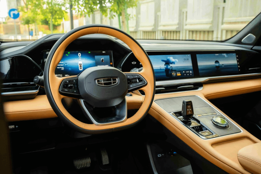 تضم المقصورة ثلاث شاشات عرض رقمية قياس 12.3 بوصة للسائق والراكب والشاشة المركزية، وتعمل بنظام Geely ONE OS، مع دعم Apple CarPlay اللاسلكي والتحكم الصوتي الذكي في أربع مناطق.