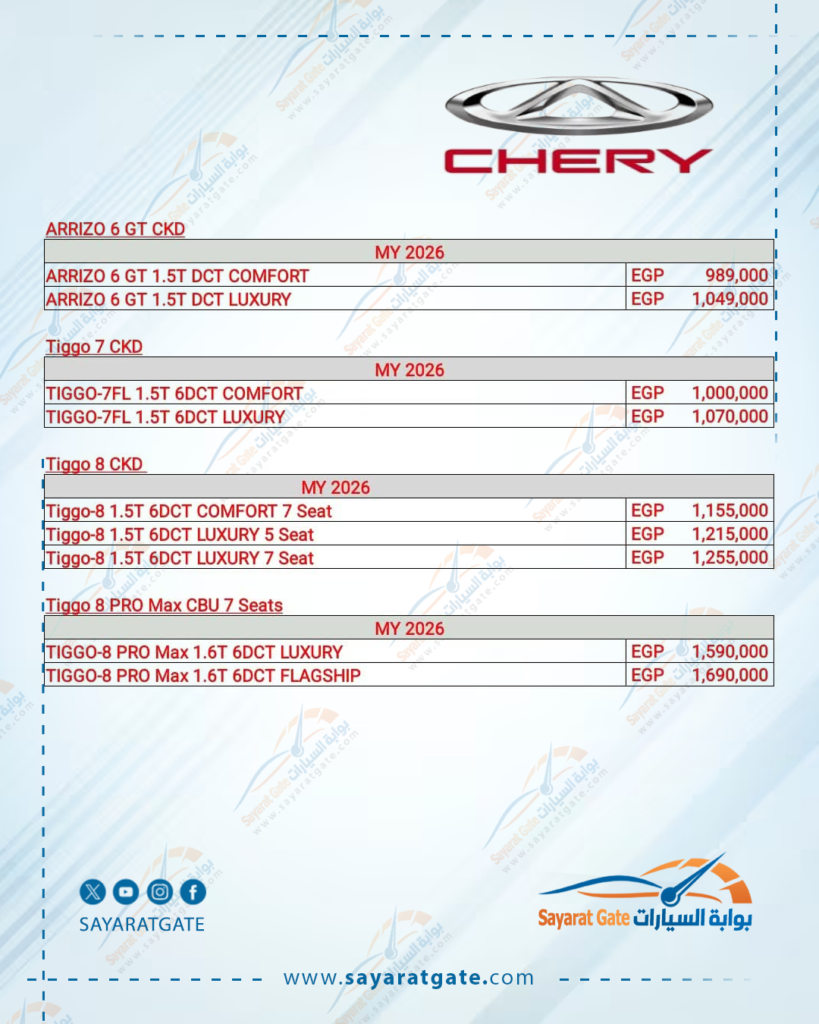 أعلنت جي بي أوتو، الوكيل الرسمي لعلامة شيري في مصر، عن قائمة أسعار جديدة لشهر أبريل الجاري، شملت زيادات متفاوتة على معظم طرازات العلامة في السوق المحلي.