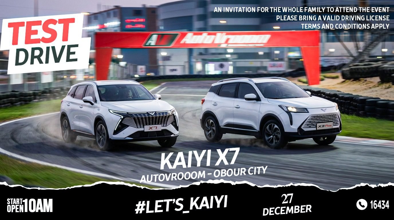 أعلنت شركة KAIYI MOTORS EGYPT عن تنظيم فعالية تجربة قيادة مميزة لسياراتها Kaiyi X3 Pro و Kaiyi X7، وذلك يوم السبت الموافق 27 ديسمبر 2025، في تراك أوتوفيروم – العبور، ابتداءً من الساعة العاشرة صباحاً
