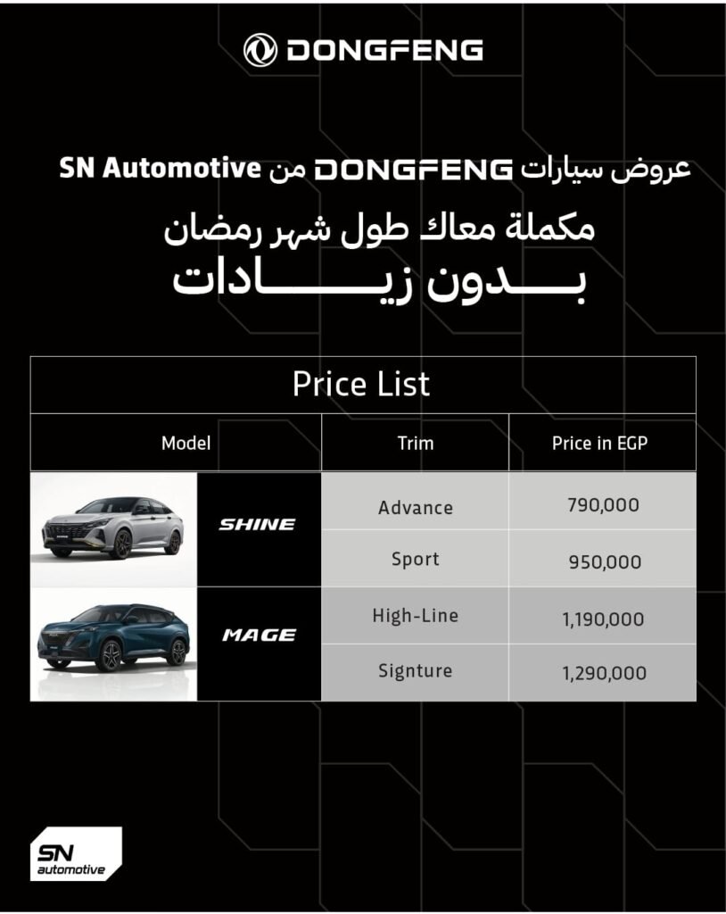SN Automotive تعلن أسعار سيارات Dongfeng في السوق المصرية